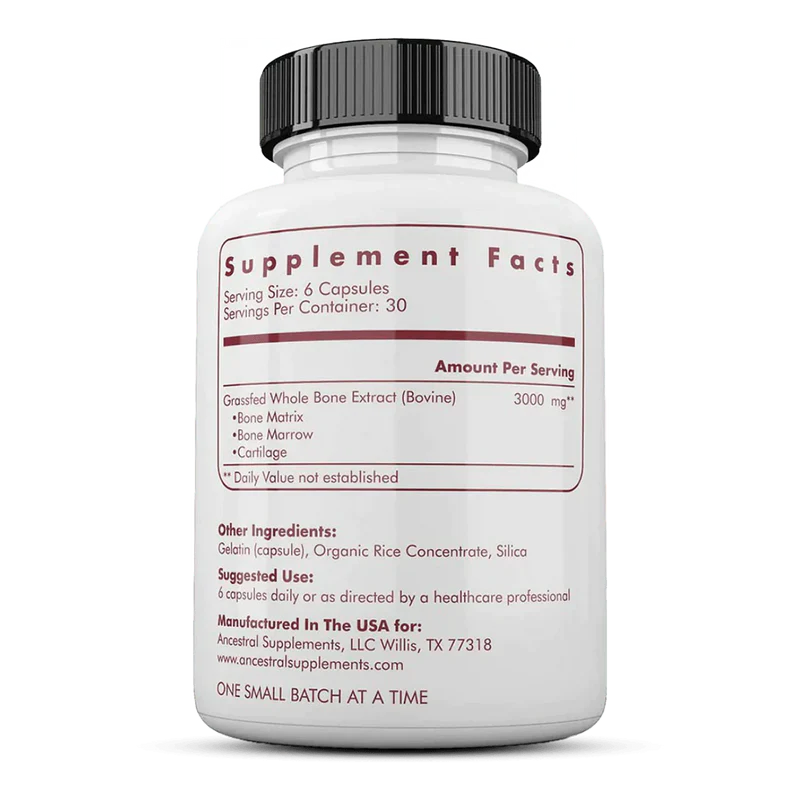 Per 6 capsules Ancestral Supplements – Runderbot & Beenmerg Capsules: 3000 mg Gevriesdroogd Grasgevoerde Runderbeenextract (Botmatrix, Beenmerg, Kraakbeen), gelatine (capsule), Biologisch rijstconcentraat, Siliciumdioxide
