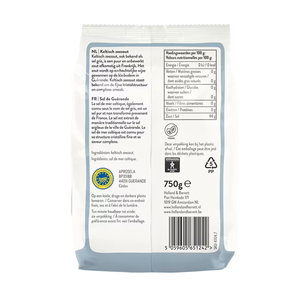 Elke verpakking bevat 750 gram Holland & Barrett – Grof Keltisch Zeezout