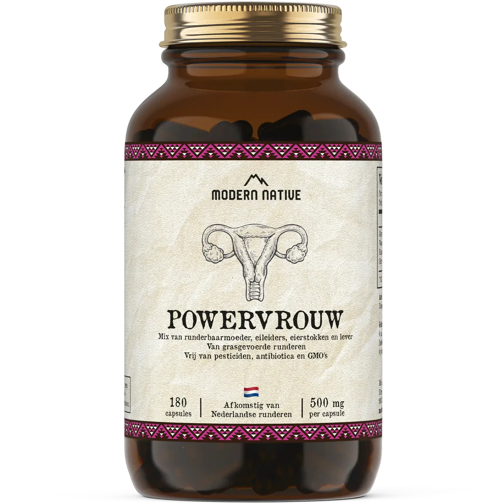 Modern Native – Powervrouw is speciaal ontwikkeld om vrouwen op natuurlijke wijze te ondersteunen in hun dagelijkse energie, fertiliteit en vitaliteit. Dit supplement combineert de krachtige voedingsstoffen van runderlever met baarmoeder, eierstokken, eileiders die passen bij de unieke behoeften van het vrouwelijk lichaam. Ideaal voor wie op zoek is naar natuurlijke ondersteuning voor energie, balans en algehele gezondheid.