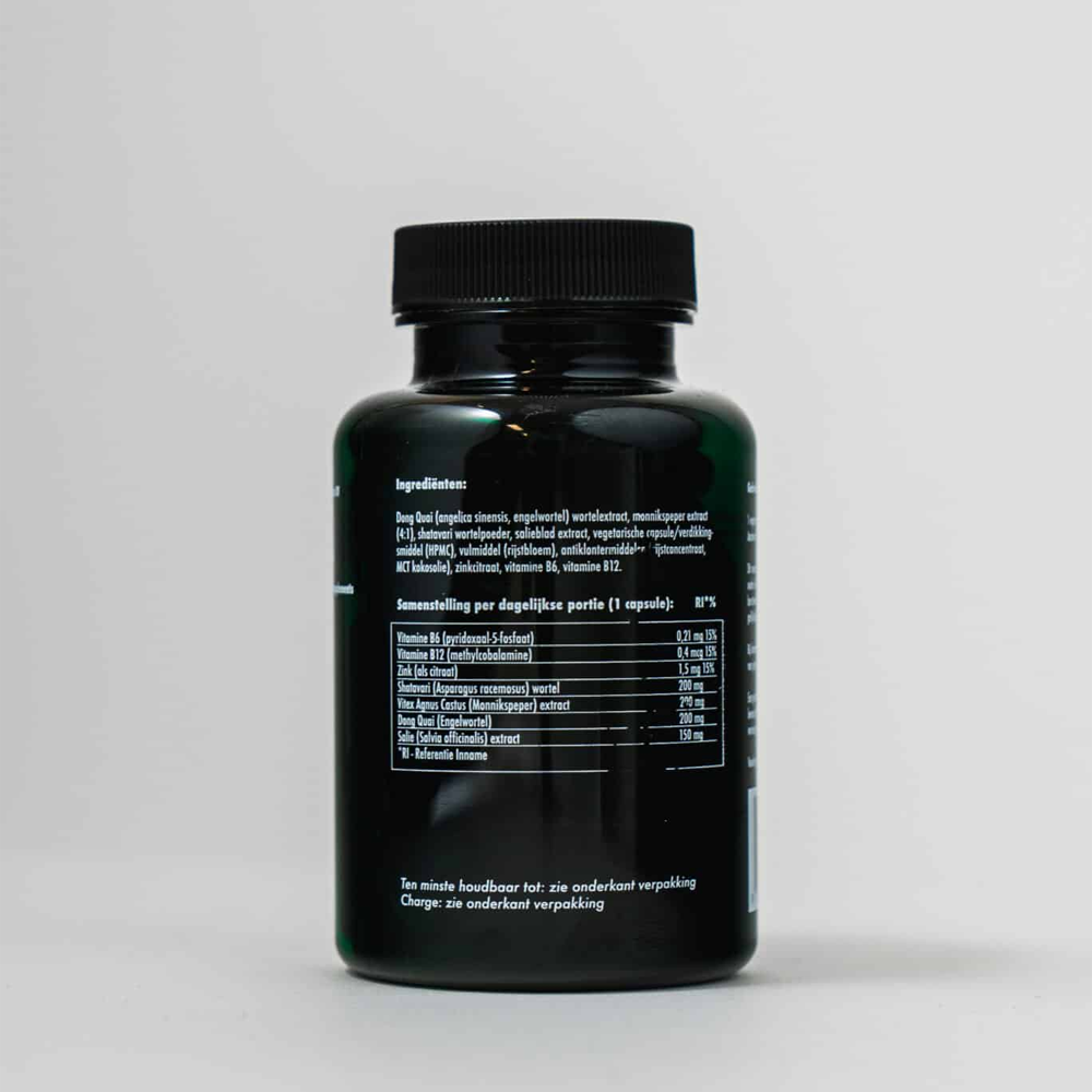 Don Quai (angelica sinensis, engelwortel) wortelextract, monnikspeper extract (4:1), shatavari wortelpoeder, salieblad extract, capsule/verdikkingsmiddel (rundergelatine), vulmiddel (rijstbloem), antiklontermiddelen (rijstconcentraat), zinkcitraat, vitamine B6, vitamine B12.