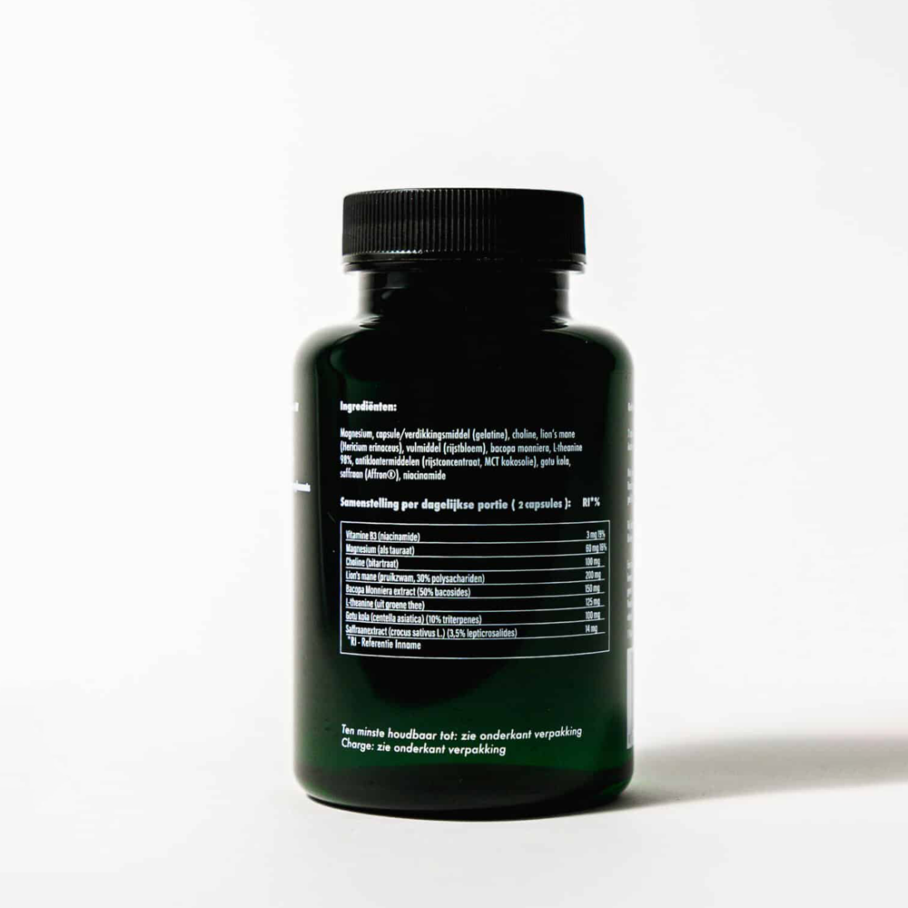 Magnesium, capsule/verdikkingsmiddel (gelatine), choline, lion’s mane (Hericium erinaceus), vulmiddel (rijstbloem), bacopa monniera, L-theanine 98%, antiklontermiddelen (rijstconcentraat, MCT kokosolie), gotu kola, saffraan (Affron®), niacinamide