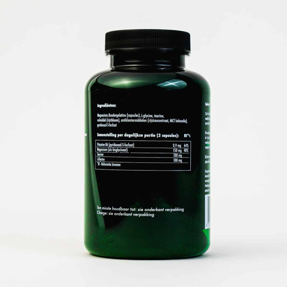 Magnesium, capsule/verdikkingsmiddel (rundergelatine), vulmiddel (rijstbloem), L-glycine, taurine, antiklontermiddelen (rijstconcentraat), pyridoxaal-5-fosfaat