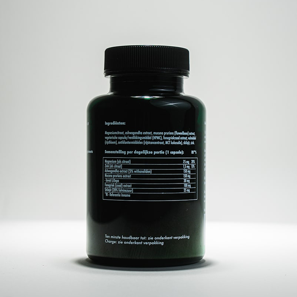 Magnesiumcitraat, ashwagandha extract, mucuna pruriens (fluweelboon) extract, capsule/verdikkingsmiddel (HPMC), fenegriekzaad extract, shilajit, antiklontermiddelen (rijstconcentraat), zink.