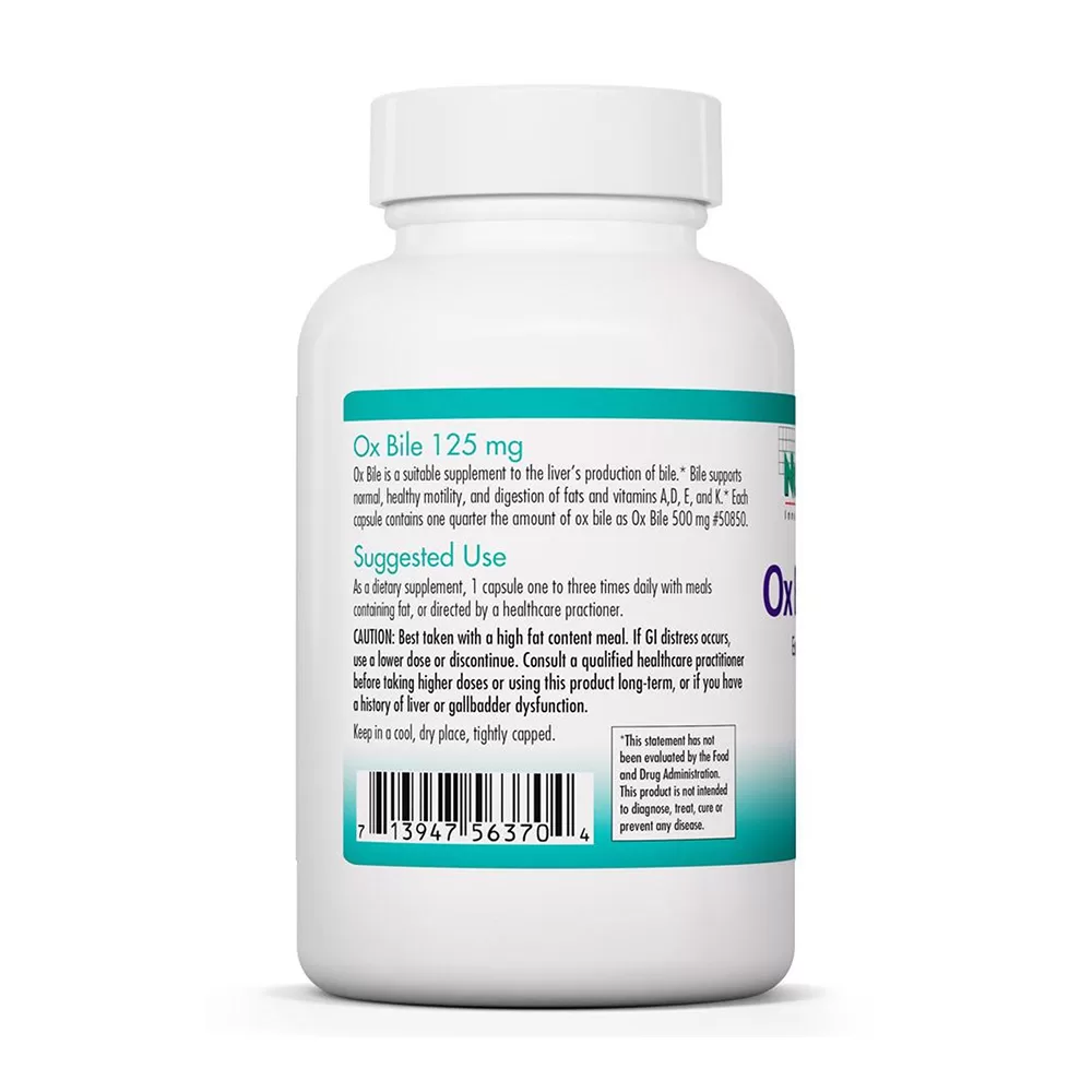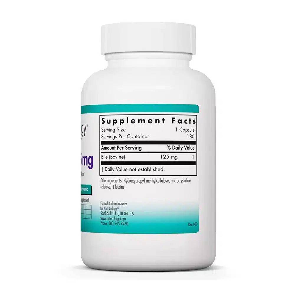 Neem dagelijks 1 capsule NutriCology – Ox Bile 125mg bij voorkeur met vetrijk eten. (Niet geschikt voor kinderen)